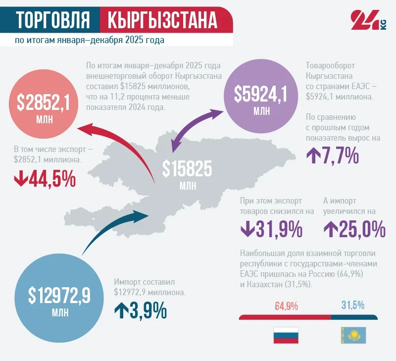 В 2025 году Кыргызстан наторговал на 11,2 процента меньше — на $15,8 миллиарда