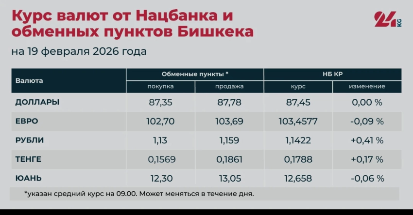 На 19 февраля текущего года официальные курсы российского рубля и казахского тенге показали рост, установив новые рекорды. В то же время, евро и китайский юань продемонстрировали снижение после недавнего укрепления, а курс доллара США остался без изменений. Эти данные представлены Национальным банком Кыргызстана и обменными пунктами Бишкека.