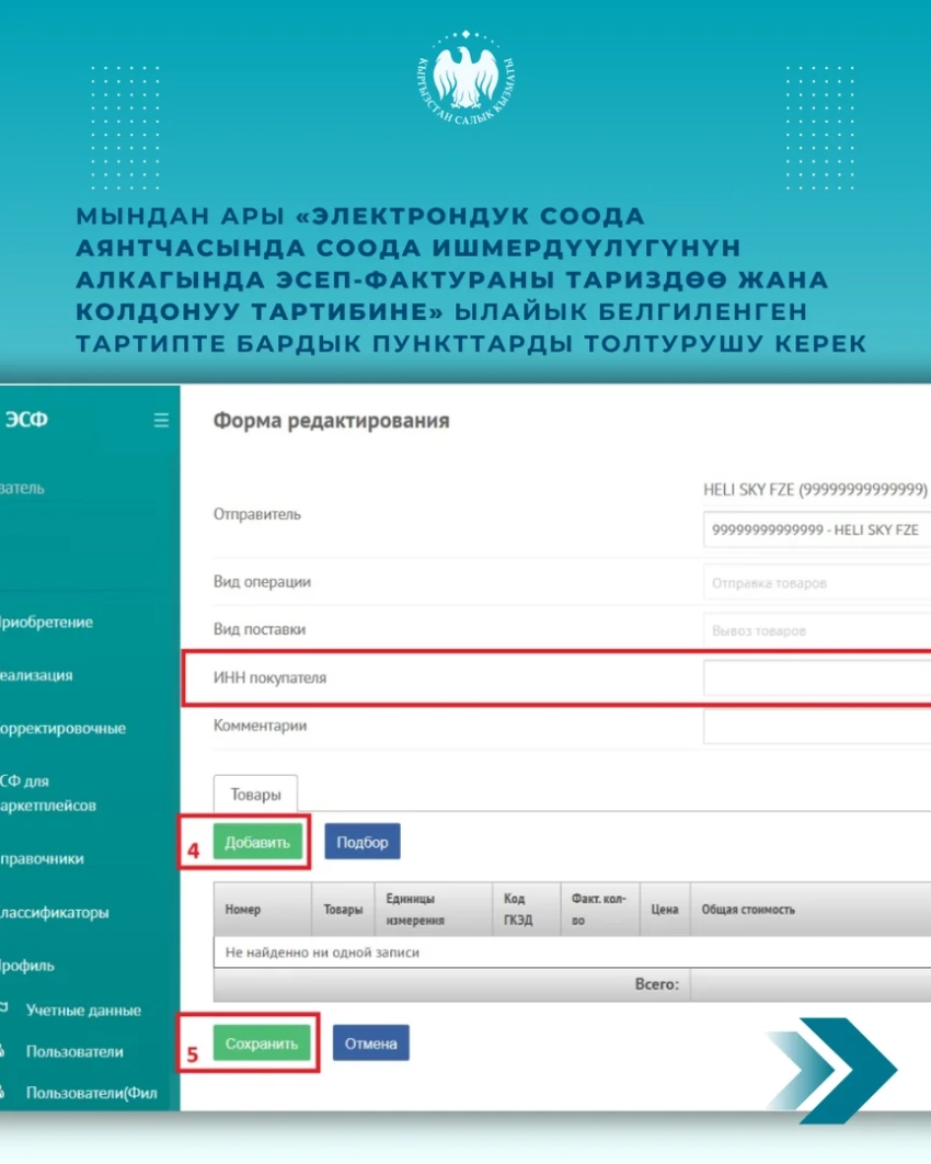 Государственная налоговая служба (ГНС) представила новую версию электронного счета-фактуры, предназначенную для торговли на электронных площадках. Эта форма ЭСФ необходима для оформления товаров, вывозимых за пределы Кыргызской Республики, и применяется исключительно для документального сопровождения экспортных товаров, которые будут продаваться через маркетплейсы.