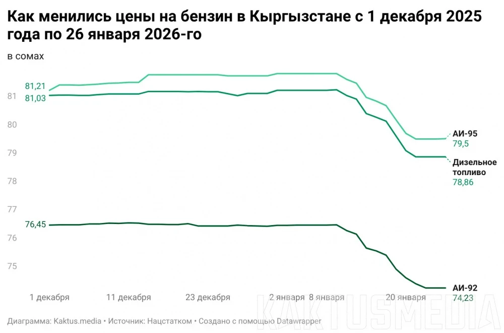Согласно данным Нацстаткома, в январе стоимость бензина АИ-92 составила около 74 сомов за литр, АИ-95 - около 79 сомов, а дизель - 78–79 сомов. Снижение цен составило примерно 2-3 сома за литр, что связано с корректировкой оптовых цен и сезонным падением спроса.