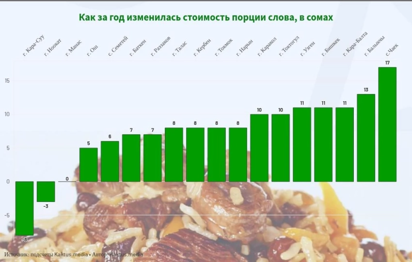 Сравнивая с прошлым годом, средняя стоимость порции плова в стране увеличилась на 7 сомов — с 109 до 116 сомов. Больше всего подорожал плов в с. Чаек, где увеличение составило почти 20%. В Кара-Суу и Ноокате цена немного снизилась, а в Манасе осталась на прежнем уровне.
