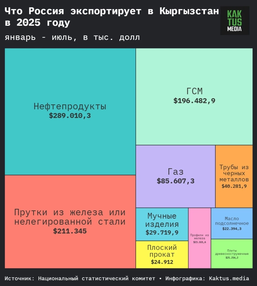Импорт товаров из России, напротив, увеличился на 4,2% и достиг $1 млрд 582,8 млн. Наиболее крупные поставки из России в Кыргызстан включают нефтепродукты (кроме ГСМ), прутки из железа и ГСМ.
