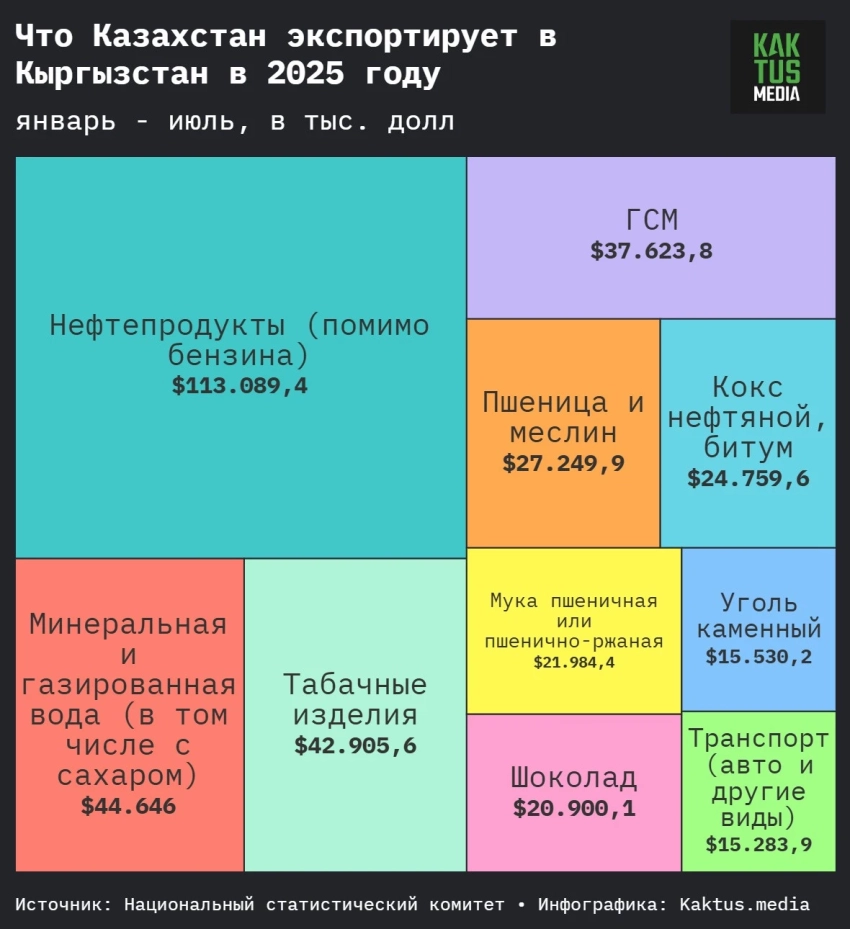 Экспорт из Казахстана в Кыргызстан увеличился на 39,8% и составил $714,9 млн. Основные поставки включают нефтепродукты (кроме бензина), минеральную и газированную воду (в том числе с сахаром), сигареты, автомобильный бензин, пшеницу и битум.