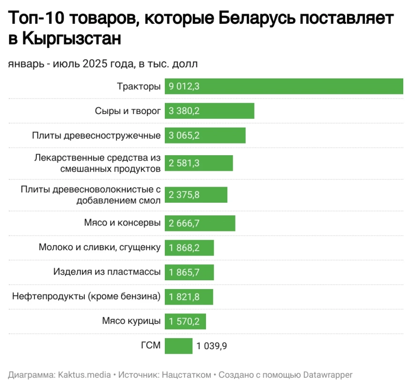 Торговый оборот с Беларусью за первые семь месяцев 2025 года составил $62,9 млн, что на 16,1% меньше, чем годом ранее. Экспорт Кыргызстана в Беларусь составил $17,6 млн, снизившись на 24%. В основном это запчасти для автомобилей, а также механическое оборудование для промышленности и продукты питания (макароны и мясо).alt="Как изменилась торговля Кыргызстана со странами ЕАЭС в 2025 году? Инфографика"