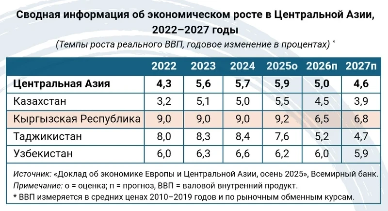 Документ также отмечает, что Центральная Азия на протяжении трех лет подряд демонстрирует статус самого быстроразвивающегося субрегиона в Европе и Центральной Азии. Прогнозируемый рост валового внутреннего продукта (ВВП) для стран региона в 2025 году составляет 5,9%, что несколько выше, чем 5,7% в предыдущем году.