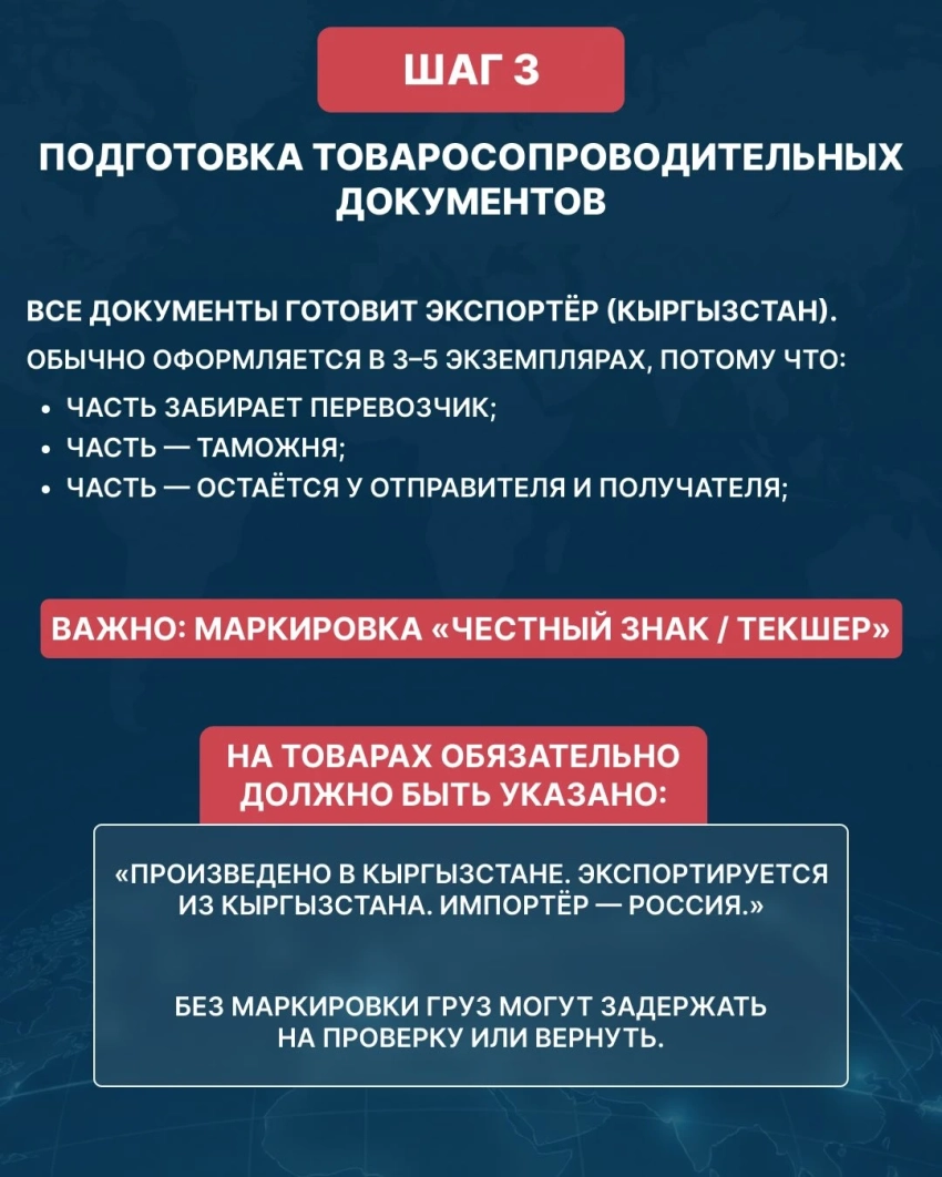 В Минэкономики акцентировали внимание на том, что соблюдение всех этих требований помогает избежать задержек на границе и обеспечивает легальный и прозрачный экспорт кыргызстанской продукции на российский рынок.