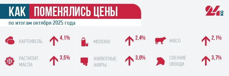 С начала мониторинга в конце октября 2018 года цена продуктовой корзины выросла на 3 тысячи 124 сом. В сравнении с аналогичным периодом 2024 года она подорожала на 965 сомов, а с начала текущего года — на 714 сомов.