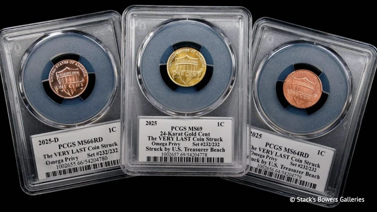 Каждый набор включает цент, выпущенный в 2025 году на монетном дворе Филадельфии, цент 2025-D из Денвера и первый золотой цент, изготовленный из 24-каратного золота с чистотой 99,99%. На всех этих монетах присутствует небольшой знак Omega.
