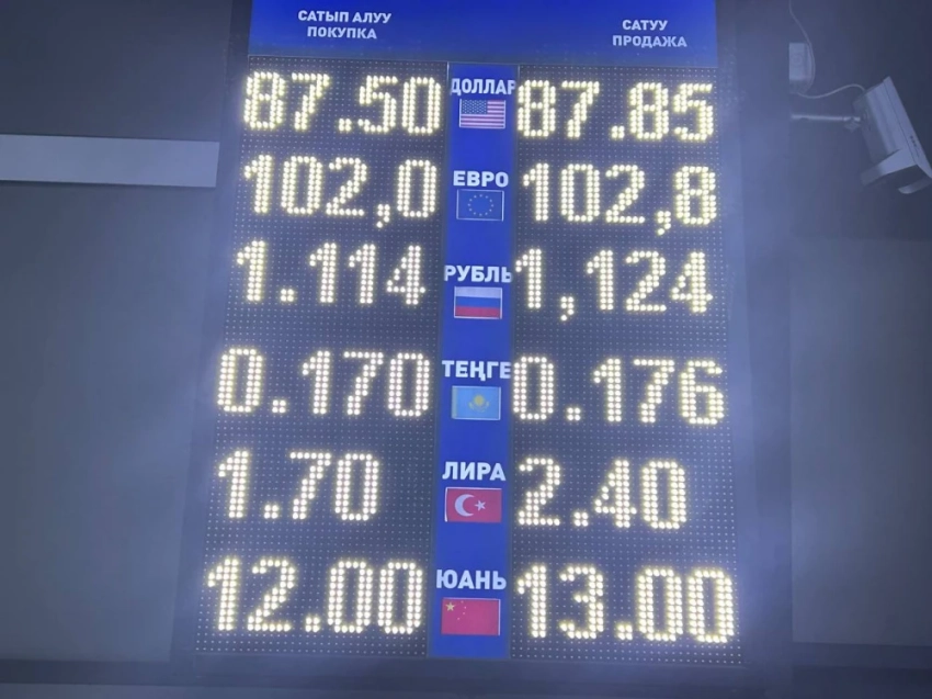 Курс доллара остался прежним: его покупают по 87,5 сома, а продают по 87,85.