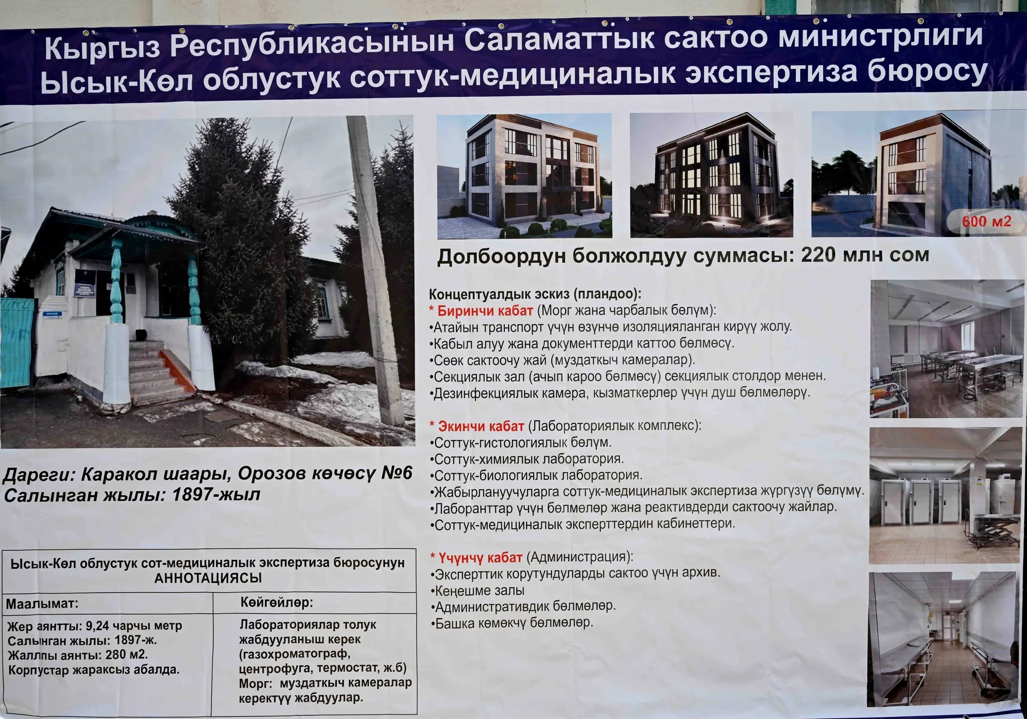 Также в рамках поездки он посетил Иссык-Кульское областное бюро судебно-медицинской экспертизы, находящееся в аварийном состоянии. Учреждение было построено в 1897 году и включает три подразделения.