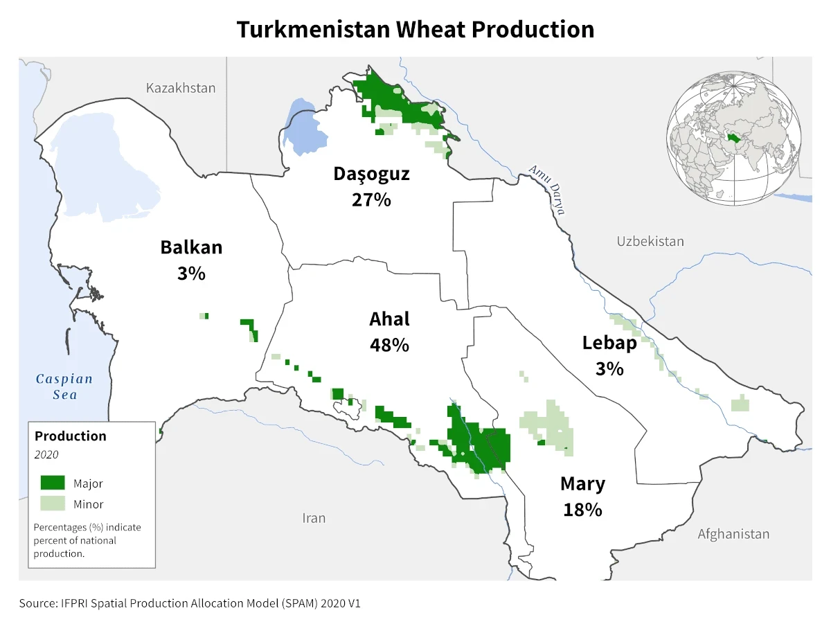 Американские аналитики оценили валовый сбор пшеницы в Туркменистане в 600 тысяч тонн, что значительно ниже официальных данных, которые составляют 1400 тысяч тонн. Как сообщает «Хроника Туркменистана», разница между этими цифрами превышает два раза. Также было отмечено, что посевные площади под пшеницу больше, чем указано в официальных отчетах, что указывает на низкую урожайность.