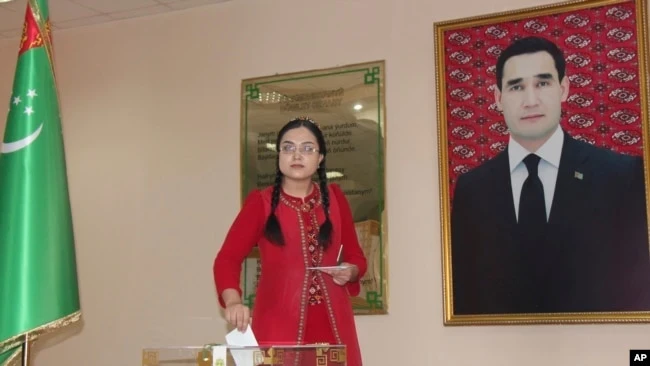 Портрет президента Сердара Бердымухамедова на избирательном участке в Ашхабаде. 26 марта 2023 года