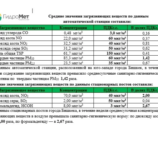Согласно информации от Управления мониторинга загрязнения окружающей среды Кыргызгидромета, в интервале с 26 сентября по 2 октября 2025 года среднесуточные значения ключевых загрязняющих компонентов в воздухе столицы превышали допустимые нормы до 2,67 раз.