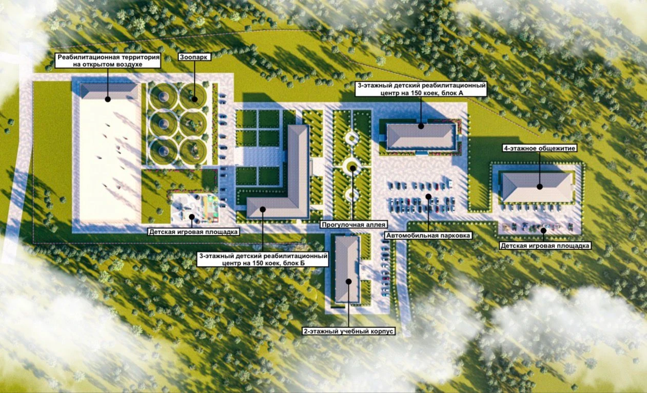 Новый реабилитационный городок будет включать специализированные центры для стационарной, амбулаторной и дневной реабилитации, а также коррекционный центр для детей с РАС и синдромом Дауна. В его состав войдет современный центр для детей с ДЦП на 150 коек, общежитие для родителей и медицинского персонала, а также образовательные и методические подразделения.