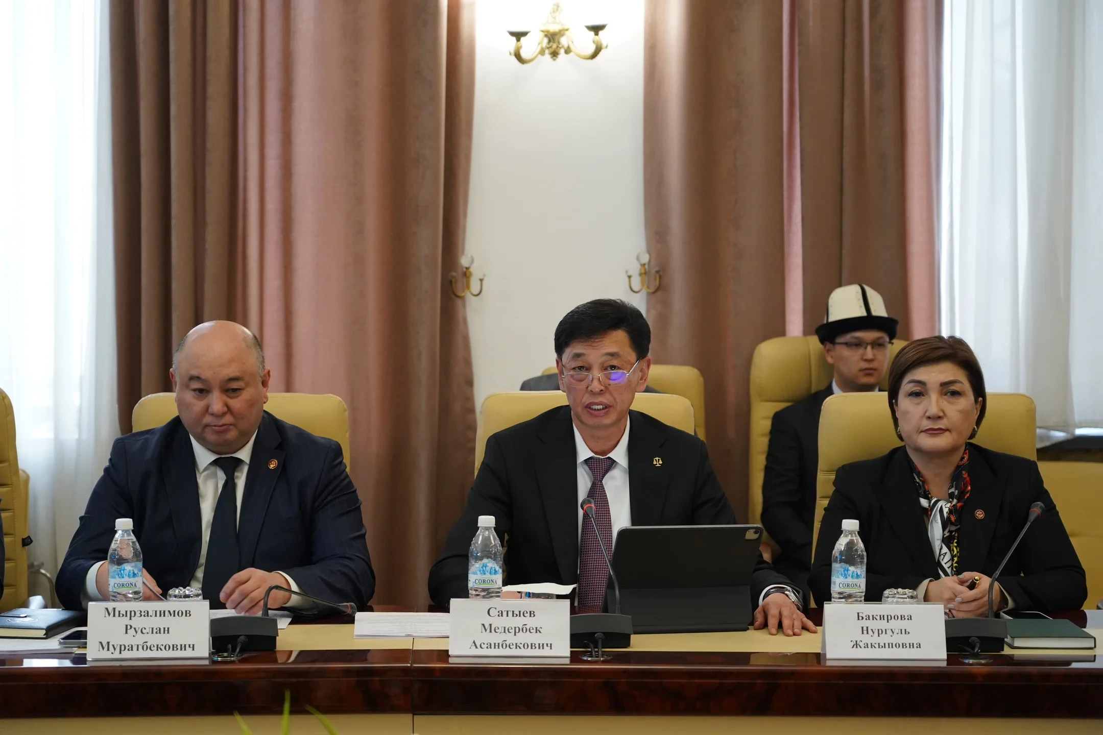 Участие в мероприятии приняли такие ключевые фигуры, как председатель Верховного суда Медербек Сатыев, его заместитель Нургуль Бакирова, а также ряд других высокопоставленных представителей судебной системы, включая советника председателя Руслана Мырзалимова и директора Высшей школы правосудия Эркина Токтомбетова.