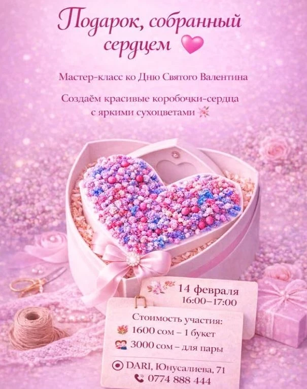 Участники создадут стильную коробочку-сердце и оформят её с помощью сухоцветов. Запись по телефону 0774888444.