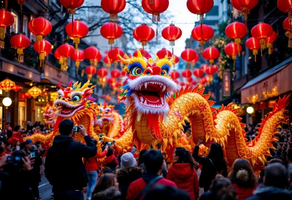 Шествия с фигурами львов и драконов также являются важной частью традиций, где лев символизирует величие, а дракон - удачу и жизненные перемены.