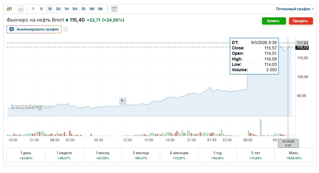 По данным РБК, с начала прошлой недели цены на нефть увеличились более чем на 50%. Главной причиной этого роста стали опасения, связанные с возможным закрытием Ормузского пролива, через который проходит около 20% мировых нефтяных поставок.