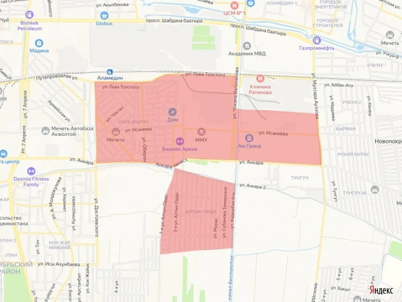 Зоны отключения включают: улицы Достоевского, Анкара, Ауэзова и прилегающие территории вдоль железнодорожной линии. Также отключение затронет жилые массивы «Алтын Ордо», «Кара-Жыгач» и Полицейский городок.