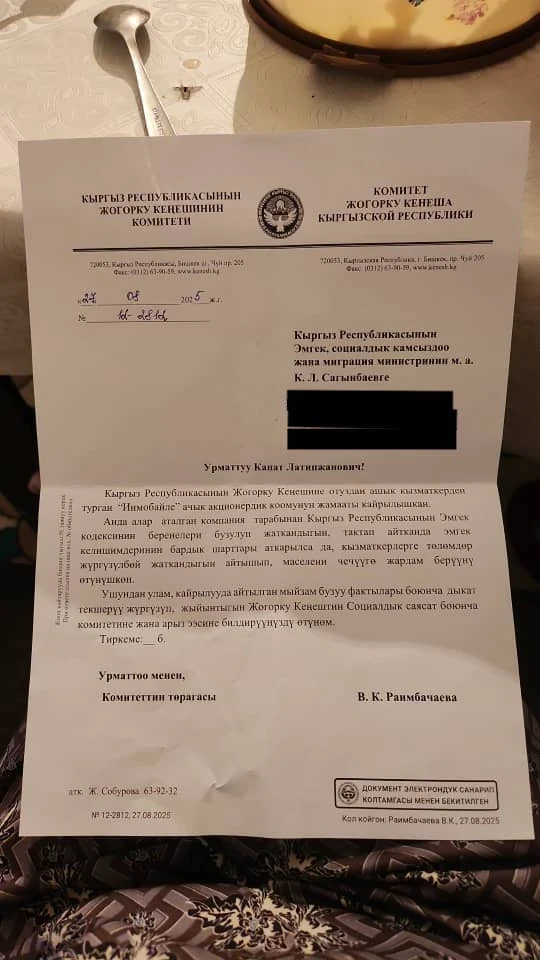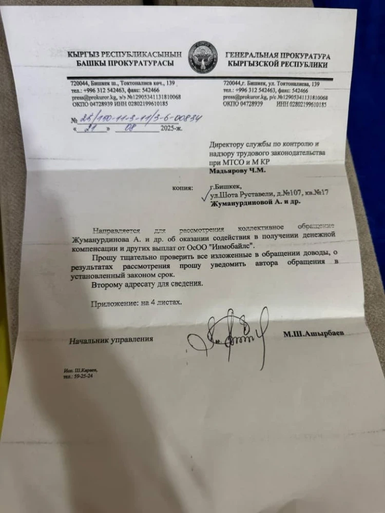 Бывшие сотрудники подали жалобы в ГКНБ, Генеральную прокуратуру, Министерство труда и миграции, а также в администрацию президента КР. Ответы пришли из администрации и ГП, которые сообщили, что запрос передан в Минтруд.