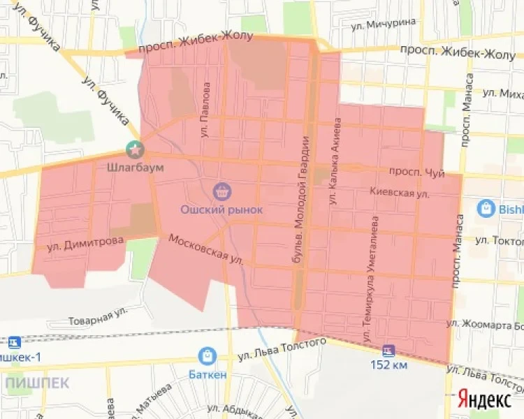 Зона, где пройдет отключение, охватывает территорию, ограниченную проспектом Манаса, железнодорожной линией и рекой Ала-Арча. Движение воды будет остановлено по реке Ала-Арча до улицы Кулиева, затем по улице Московской до улицы Дмитрова, по улице Орозова до улицы Казакова, и далее по проспекту Д.Сяопина до реки Ала-Арча. Также в зону отключения попадают проспект Ж.Жолу, бульвар М.Гвардия, улица М. Фрунзе, улица Турусбекова, проспект Чуй и вновь проспект Манаса до железной дороги.