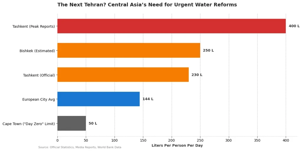 Важное внимание авторы уделяют состоянию водопроводных систем Ташкента и Бишкека, которые в основном остались с советских времен и часто находятся в аварийном состоянии. В Узбекистане водопотребление составляет около 400 литров на человека в день, что почти вдвое превышает показатели европейских стран, делая города особенно уязвимыми к перебоям в водоснабжении.