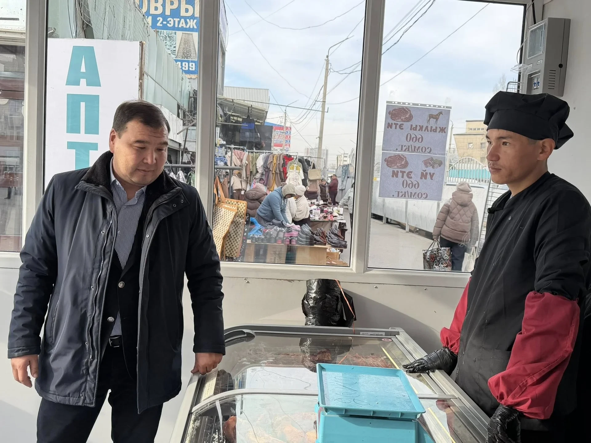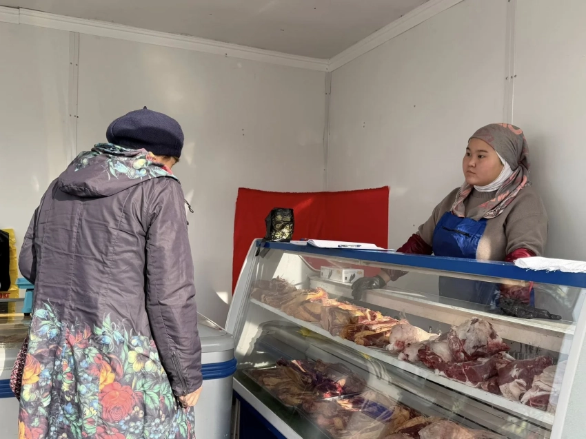 У входа на Ошский рынок открыли соцмагазин мяса по сниженным ценам