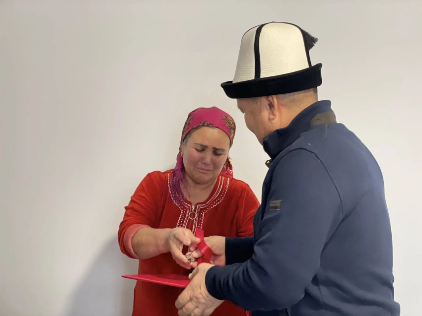 Женишбек Токторбаев, мэр города Оша, вручил ключи от нового дома многодетной матери Розе Абдыкаровой, которая долгое время работала уборщицей в школе имени С. Жигитова.