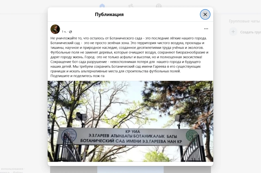 Жители Бишкека активно выступают в социальных сетях с призывом подписать петицию против планов по застройке Ботанического сада имени Энвера Гареева. Гражданские активисты требуют остановить проект, который предполагает создание футбольных полей на территории, известной как «легкие» города.