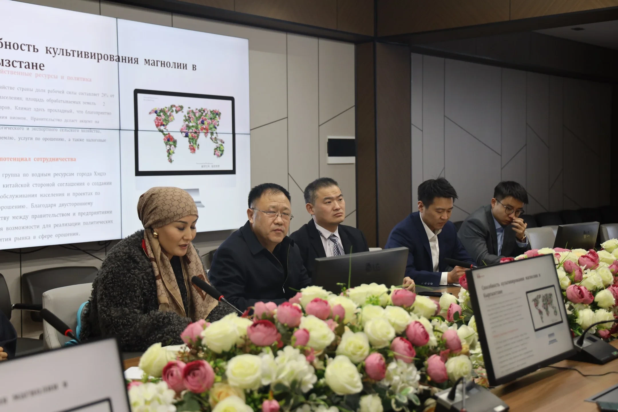 На встрече обсуждались аспекты выращивания цветов в Кыргызстане, включая условия для культивирования пионов и возможности для сотрудничества в рамках инициативы «Один пояс — один путь» между Кыргызстаном и Китаем.
