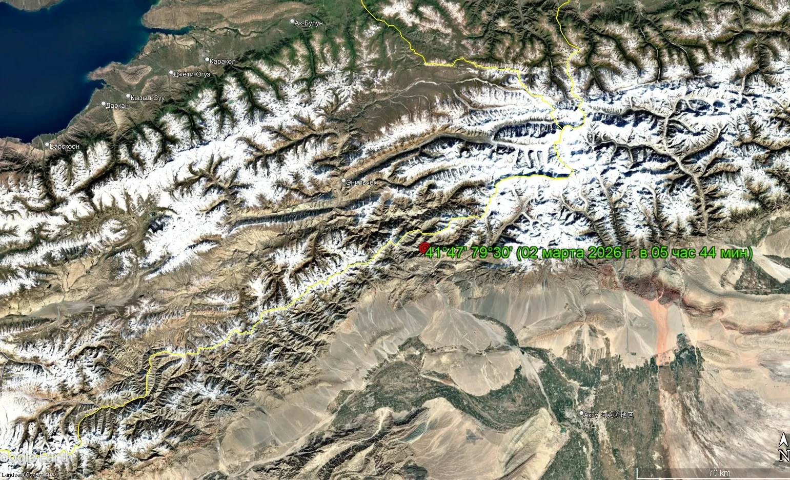 На утро сегодняшнего дня на границе между Кыргызстаном и Китаем произошло землетрясение, о чем проинформировал Институт сейсмологии Национальной академии наук Кыргызской Республики.