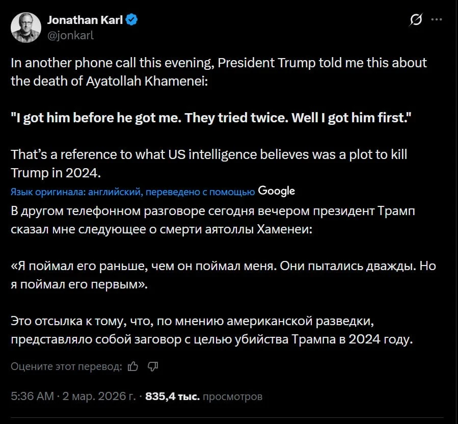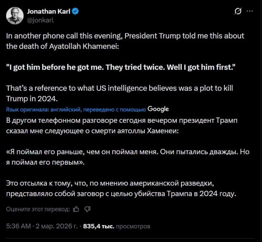 Президент США Дональд Трамп заявил, что власти Ирана дважды пытались его устранить. Об этом он рассказал в интервью ABC News журналисту Джонатану Карлу, добавив, что, убив аятоллу Али Хаменеи, он опередил иранцев в их намерениях.