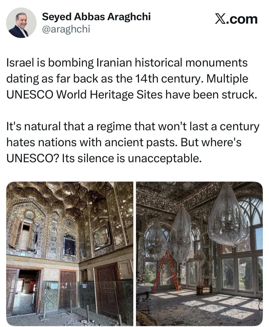 «Израиль бомбит исторические объекты Ирана, некоторые из которых датируются XIV веком. Под ударом оказались объекты, включенные в список Всемирного наследия ЮНЕСКО», — отметил он в своем аккаунте в Х.