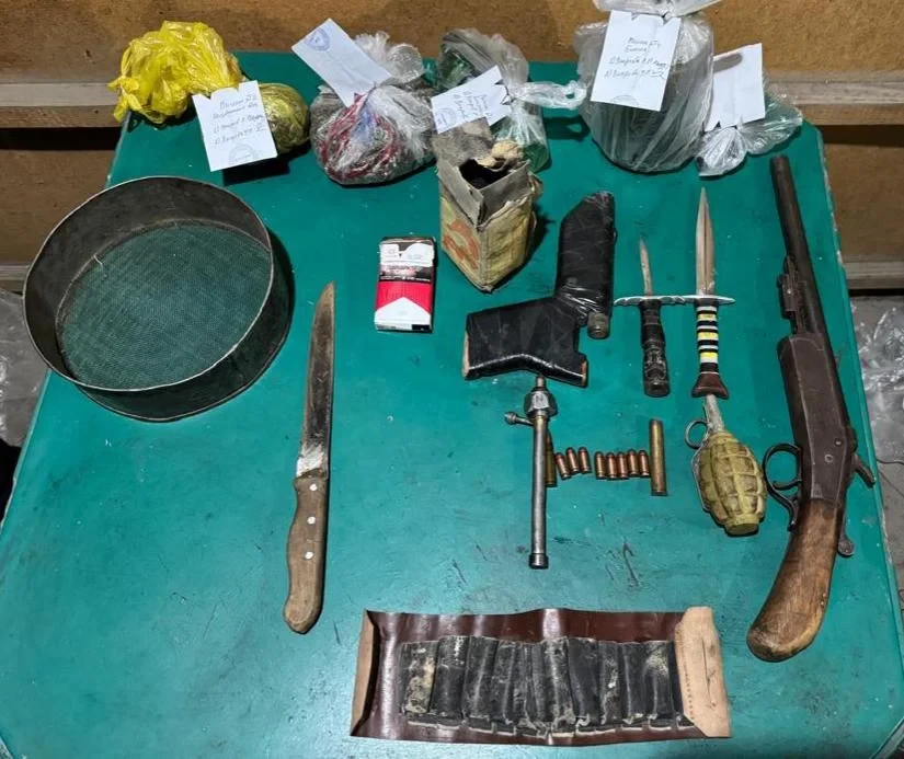 При обыске в доме задержанного были найдены два пакета с коричневым веществом, обладающим характерным запахом конопли, весом 138 и 102 грамма; самодельная трубка для курения, пластиковая бутылка, самодельный пистолет, обрез, граната, восемь патронов, один патрон, одна гильза и коробка с порохом; два ножа.