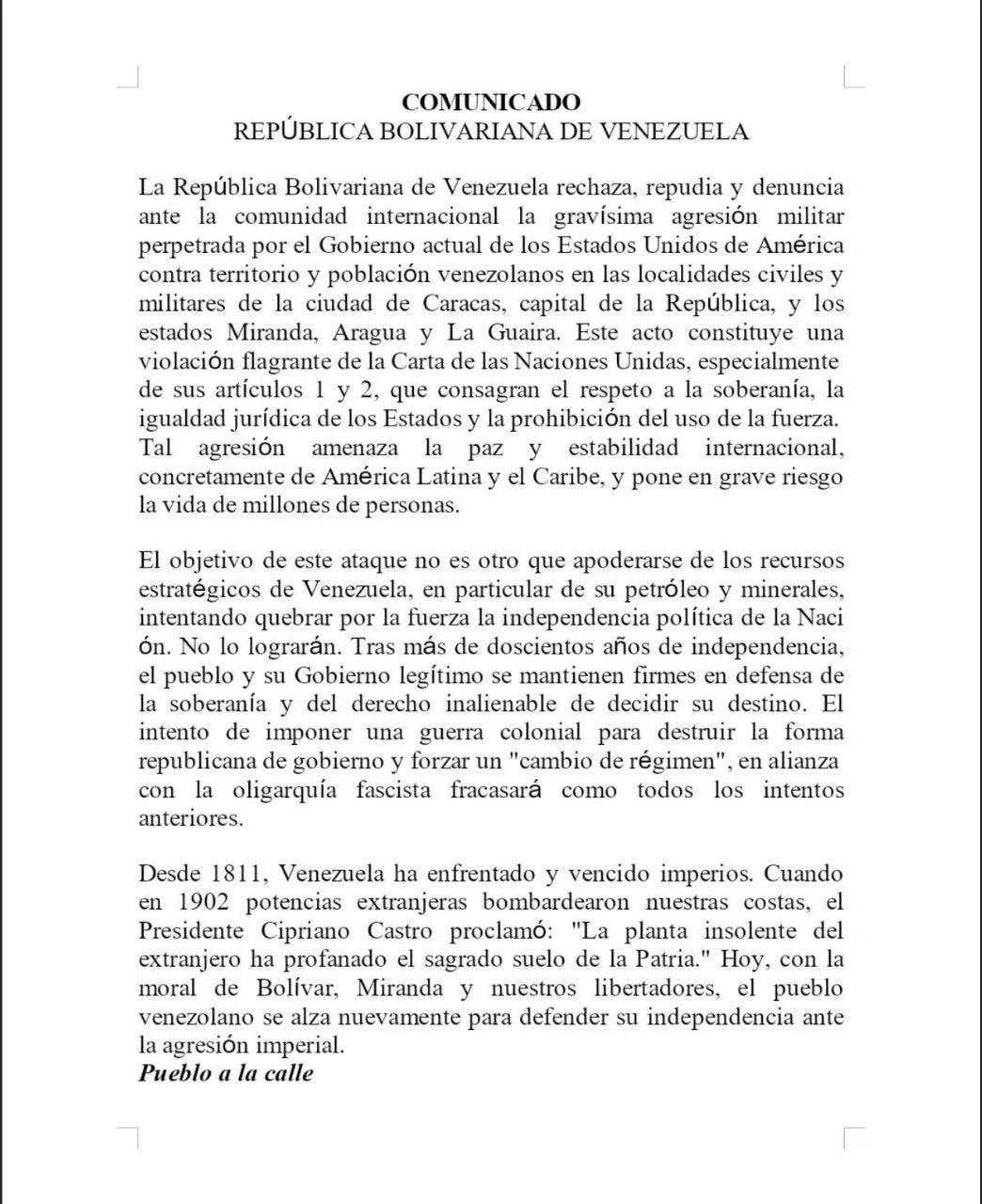 По словам министра иностранных дел Венесуэлы Ивана Хиля Пинто, «страна столкнулась с военной агрессией со стороны США». Он отметил, что целью этого нападения является захват ресурсов, таких как нефть и полезные ископаемые, а также подрыв политической независимости Венесуэлы.