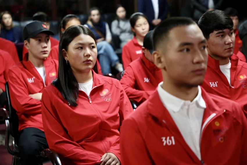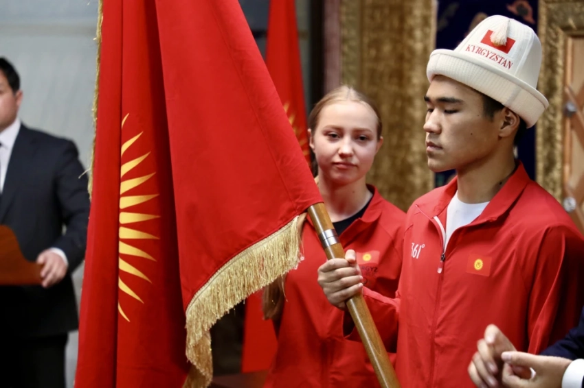 Государственный флаг Кыргызстана был торжественно вручен капитану команды Улану Майрамбекову и спортсменке Доминике Чернецкой, что символизирует поддержку и гордость за спортсменов.