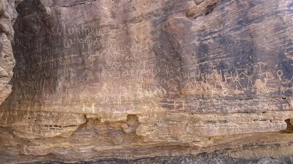 На восточном склоне плато Умм-Ирак находится скальный навес длиной более 100 метров, на котором изображены различные сцены — от охоты до людей с оружием, а также символы и надписи на арабском и набатейском языках. Эти изображения датируются как доисторическим периодом (примерно 10-5,5 тыс. лет назад), так и более поздними временами.