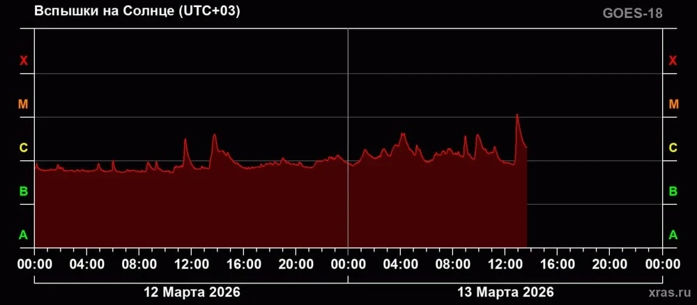 По информации, поступившей от Лаборатории солнечной астрономии, 13 марта в 12:55 по московскому времени на Солнце произошла вспышка класса M1.2, которая длилась примерно 20 минут. Источник отмечает, что это событие стало первым за почти месяц, поскольку предыдущая вспышка такого же класса была зафиксирована 25 февраля.