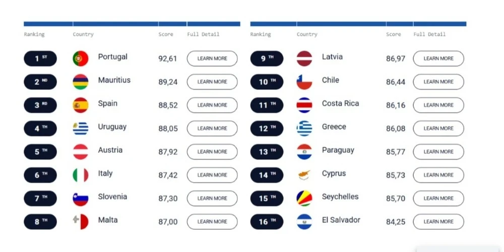 В этом рейтинге лидируют не только Португалия, но и Маврикий, Испания, Уругвай и Австрия, которые продемонстрировали высокие баллы по всем критериям и стали наиболее привлекательными направлением для пенсионеров в 2025 году.