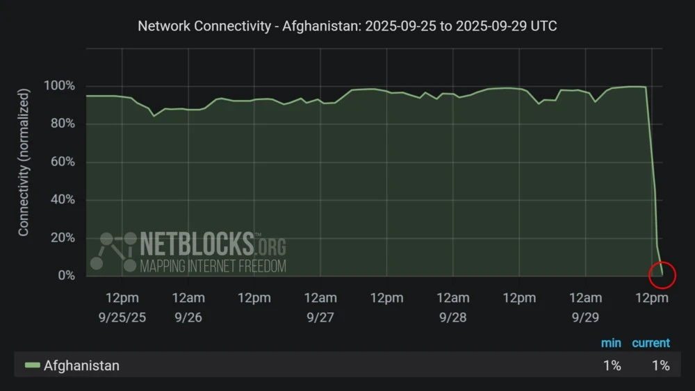 По данным NetBlocks, проблемы также наблюдаются в работе мобильных сетей в стране. В частности, 17 сентября лидер «Талибана» Хайбатулла Ахундзада запретил использование оптоволоконного интернета в провинции Балх, а позже этот запрет был расширен на другие регионы. По заявлениям правительства, данная мера направлена на борьбу с распространением безнравственности.