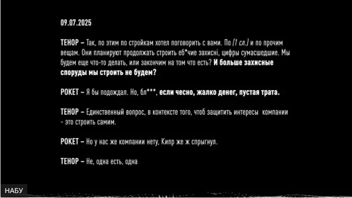 На одном из фрагментов «Рокет» (по версии НАБУ — бывший советник министра энергетики Игорь Миронюк) и «Тенор» (по версии НАБУ — директор «Энергоатома» по безопасности Дмитрий Басов), обсуждая давление на подрядчиков, заявляют, что если предприятие не заплатит «откат», его следует исключить из числа контрагентов «Энергоатома», и тогда всех его работников «заберут в армию».