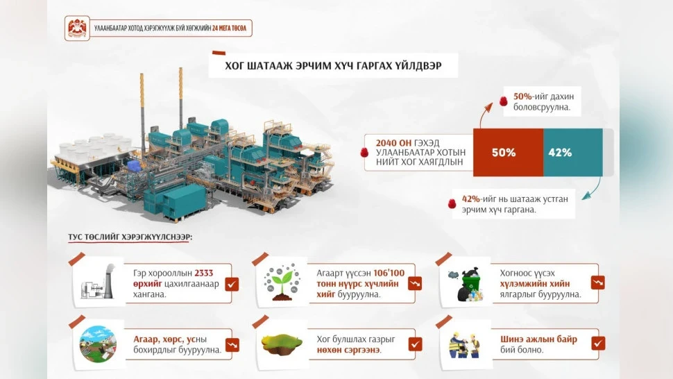 Государственная администрация Улан-Батора объявила, что в прошлом месяце было подписано соглашение о государственно-частном партнерстве (ГЧП) для строительства данного завода. Это соглашение стало одним из первых крупных проектов, реализуемых в рамках Закона о ГЧП. Подрядчиком выступит компания Renshou Sichuan LLC. Площадка для завода, который будет сжигать 1500 тонн отходов ежедневно, расположена на территории в 10 гектаров в районе Морингиин Даваа, 12-го хороо Хан-Уула. Объем инвестиций в проект составляет 206,5 миллиона долларов, а строительство займет 30 месяцев. После этого завод будет передан правительству на срок эксплуатации в 28 лет.