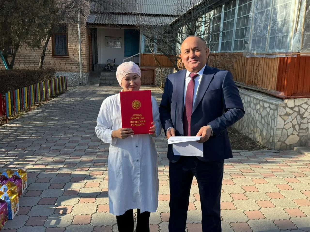 В завершение мероприятий, заместитель министра Рыспек Сулкайдаров передал тёплые поздравления и слова поддержки коллективу и детям Республиканского специализированного центра реабилитации детей и семьи с поражением центральной нервной системы и нарушением психики в городе Токмок. Детям были вручены новогодние подарки, а сотрудникам - премии и почетные грамоты Министерства здравоохранения Кыргызской Республики. Также учреждение получило сертификат на сумму 200 тысяч сомов в поддержку своей деятельности.