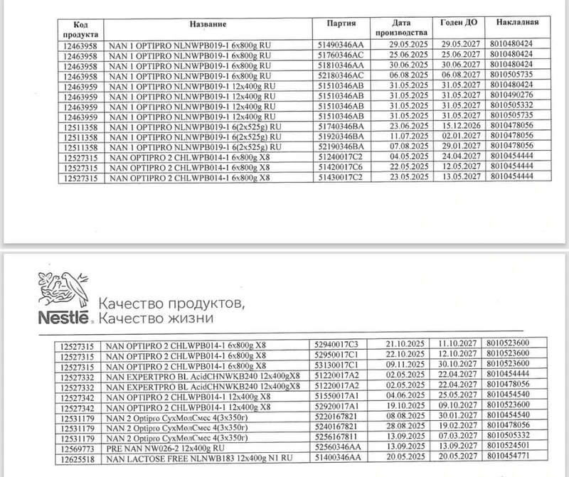 По информации дистрибьютора, центральный офис Nestlé в России принял решение о добровольном отзыве конкретных партий детского питания. Это касается сухих быстрорастворимых молочных, безлактозных и кисломолочных смесей, таких как NAN 1 OPTIPRO, NAN OPTIPRO 2, NAN EXPERTPRO, NAN 2 OPTIPRO, PRENAN и NAN LACTOSE FREE, с определёнными датами производства.